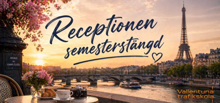 Från och med 22/12 har receptionen semesterstängt fram till 7/1. Vi hanterar alla era frågor och funderingar på info@vallentunatrafikskola.se under den tiden. För bokning av lektion/utbildning samt köp av paket hänvisar vi till e-handeln här på hemsidan. Vi passar på...
